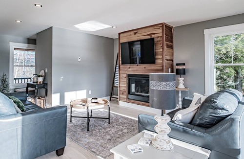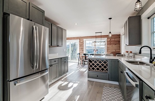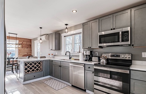 Hennessey's Hide A Way is a brand new cottage perched above Christopher Lake in Bryant Pond with views of Mt. Christopher and Mt. Abram ski resort. Located on a quiet private road just 1 mile to swimming or hiking, 5 miles to skiing and mountain biking at Mt. Abram and 15 miles to Sunday River Ski and Golf Resort. The property accommodates up to 12 guests comfortably, in 4 bedrooms. The master suite offers a king bed with glass tiled shower, walk in closet and tremendous views. Bedrooms 2 and 3 have queen beds and share a full bath. Bedroom 4 has a full size bed as well as a set of twin bunks, great for all the kids to bunk together or for a family with little ones and a shared full bath with tub. The kitchen, dining, and living areas are thoughtfully laid out with charming touches throughout. The kitchen is well equipped for everything you will need to prepare a simple snack or a full meal for everyone. Seating at the kitchen peninsula along with the dining table offer a spot for everyone to come together. The living area is the perfect spot to relax after a day on the water or the slopes. Sit back and enjoy the view, watch the large TV or enjoy the ambiance and warmth of the fireplace. The extra family room on the lower level is a great place for the kids to hangout and play games or watch TV. The deck is perfect to watch the sun sink behind the mountain or the fireworks from Mt. Abram as well as listen to the loons on the lake below. The cottage was designed with vacation get a ways in mind. Rather you are looking for a serine relaxing stay, just enjoying nature, the views and cozy furnishings or, an adventure filled trip this is the perfect destination. The views of course are amazing add in the cozy furnishing and décor and you may not want to leave the property. If your group has more adventure in mind you are close to swimming, hiking, down hill and cross country skiing, mountain biking, dog sledding, golf, fishing casino and more! There are also plenty of options for dining, shopping, and entertainment as well, ask us about our favorites. The damage waiver fee of $150.00 is a non-refundable payment- which covers accidental damage up to the amount of $1500.00. This fee is processed in the overall costs of the rental at the time of booking. Remember we are in the mountains of Maine and the snow we hope for all year can make travel more difficult. We recommend all or 4 wheel drive in the winter season. The roads and driveway are professionally maintained but guests may find travel difficult without it.