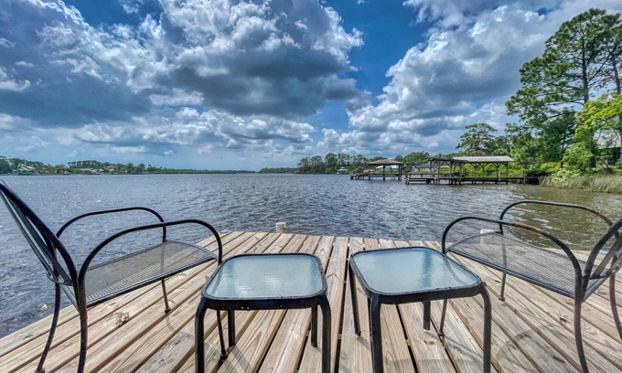 Over an acre of privacy with this waterfront home with boat slip & private dock. Enjoy Wi-Fi Streaming TV, Open Floor Plan, Living & dining, Kitchen breakfast dining, Exterior Dining with fenced in courtyard, and a screened Florida room, King Size beds, Guest Twin set beds, washer dryer in home, provided linens, towels, beach towels, beach chairs, Umbrella, non aggressive breed dogs considered. Minutes to beach, golf courses, shopping, downtown walking streets, farmers markets, and easy access to commute to central Florida attractions, long term stays rates available