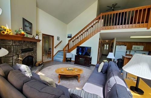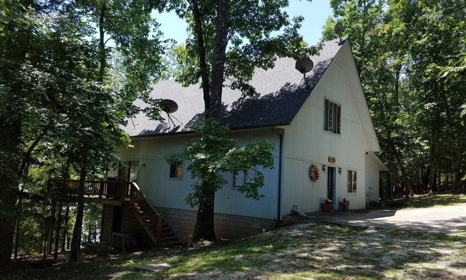 This is the lake experience that everyone wants. Located in a wooded area & has a private shoreline on the big part of the lake. Come enjoy this wonderful two-level lakefront home with 3 regular bedrooms, a HUGE Loft Bedroom with a Queen bed & Queen sofa-sleeper and a sunroom with twin trundle beds. There are 2 bathrooms on the main level and a 3rd bathroom in the loft. Located down a small stretch of a gravel road.