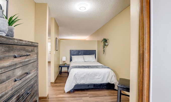 Welcome to the Aviator's Lounge, a charming 1-bedroom located near the airport. Perfect for travelers and professionals, it offers a stylish inviting living room with a plush gray sofa, modern decor, and a smart TV for your entertainment. The bedroom features a cozy full-sized bed, ensuring restful nights, while the private bathroom includes a shower and bathtub for added convenience. With its prime location and thoughtfully designed spaces, it’s your ideal home base for relaxation & comfort.