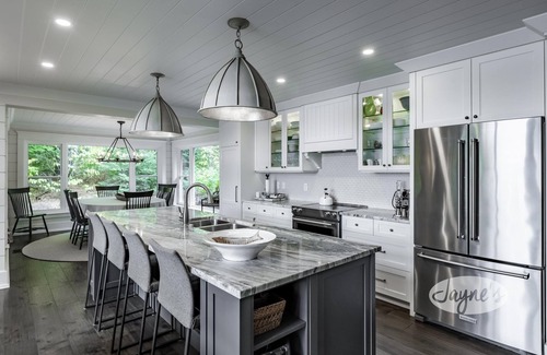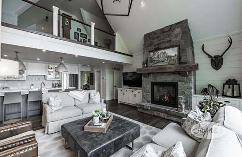 Level entry into the cottage from the driveway. Well positioned laundry room/mud room with 2nd fridge tucked off to the right, but straight ahead the full lake view through the 2 storey window draws you in. Light and bright with modern shiplap paneled walls and many custom details.