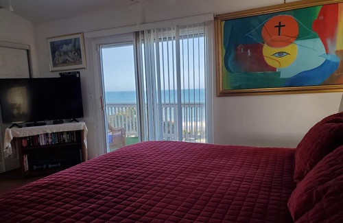 A Picturesque Ocean Front 2-Story warm cozy and charming "beach house" right on the beach for beach fun sunning, sand castles, and long walks just steps away from the ocean, a pool of fun swimming, tubing, floating, kayaking, paddle boarding, surfing, fishing, snorkeling and more. Once described by a guest to be an "eccentric and funky" place is more aptly described as an imaginatively fun and artsy "beach house" with tastefully selected art, sculptures and figures. On a Private Beach makes for a fun family vacation located in the quaint Town of Melbourne Beach, Florida. It is paradise ripe fun filled get-a-away for a relaxing quiet stay or, one packed with surfing, paddle boarding, kayaking, surf fishing, swimming, snorkeling. kite flying, kite surfing, wind surfing, and tubing for the ocean frolics to be combined with all the beach-sun fun. From the top deck one can Catch and capture the Cape Canaveral rocket launches. These rocket launches are readily seen from the patio deck with or without the telescope. The "beach house" is convenient to plenty of golf, boating, bicycling, jogging, restaurants, major shopping including that of down-town Melbourne. It has 3 bedrooms with king-size beds and 3 1/2 baths with elevator for handicap guests and an outdoor shower for rinsing from the day at the beach. The beach house is located on nearly acre, its an private ocean front estate with pet friendly escapes to a fenced yard for their personal business. Oh, you must experience for yourself. a bottle of champagne awaits you. Making your most enjoyable your host,