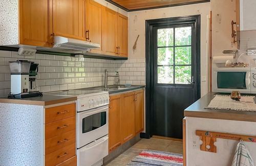 Your holiday home offers you everything you need for a cosy holiday in Sweden. Inside, you will find an inviting living area with a comfortable sofa and armchair. Wind down at the end of the day or warm yourself by the wood-burning stove, which creates a cosy atmosphere. Prepare your favourite dishes in the functional kitchen and use the adjoining dining area for communal meals and sociable evenings in cosy surroundings.