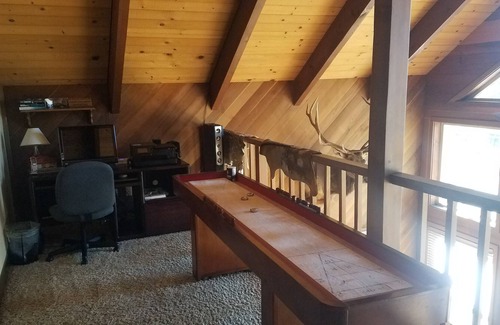 Our newly updated home is quite an escape. When you walk thru the door you'll find granite counter tops, all stainless appliances in the kitchen, slate and travertine tiled bathrooms and beautiful warm colors and accessories. All this and we still kept the 'rustic' traditional A-frame cabin feel! No a-frame is complete without floor to ceiling windows and ours looks out over the lake where you can enjoy both the sunrise and sunset on the mountains.
