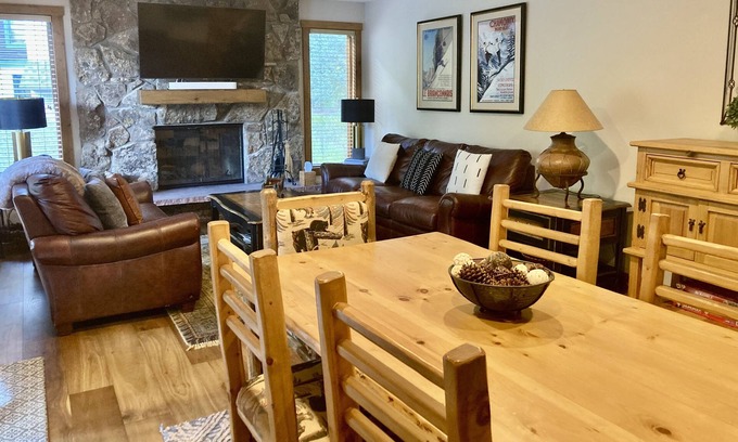 Lots of sun in this spacious 2 bedroom, 2 bath (sleeps 6). The kitchen, dining and living room area are an open floor plan, perfect layout for enjoying your company. Relax and enjoy the wood burning fireplace while watching a movie on the new 55" 4K Smart TVs in the living room and master bedrooms. High speed internet access for working, streaming or gaming. Kitchen has everything you'll need to prepare meals if you choose to stay in. Large sunny deck, with gas grill, overlooking open space to enjoy wildlife viewing, just off the living room. Outdoor pool , available in the summer time only. Tennis courts available during summer.
