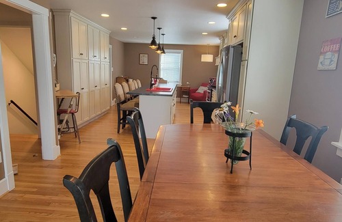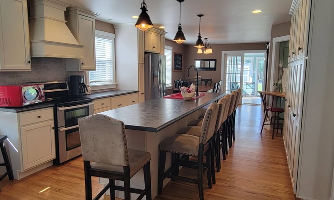Classy 2 story home, with 3 bedrooms and a extra attic space with a queen bed that adjoins a large room, remote work space, lots of spaces to eat meals together, fun hangout recreation space in the basement, sun room, outdoor patio and spacious yard. Safe neighborhood!