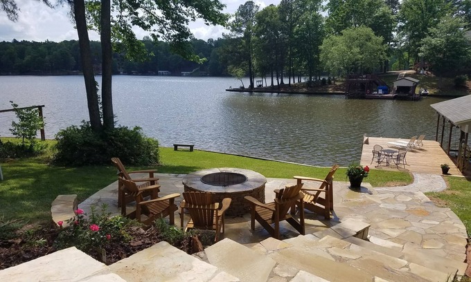 While the inside has all the comforts of home, it's the lakeside view our guests will rave about. This home includes multiple outdoor seating areas for you to choose from to relax or gather with friends. Spend lake front time on the main level deck (complete with a gas grill), or rest on the patio on the lower level with ping pong table, charcoal grill and newly built fire pit! The fire pit is nestled in the middle of a stone seating area with Adirondack chairs built for relaxing and taking in the scenery day and night! Don't forget the fixings for S'mores over the fire pit! A paved walkway on a gentle slope leads you to a large dock, perfect for sunning, and with a water depth of eight feet, it's also great for swimming, floating and fishing. A boat house is located on the dock with 2 paddle boards and 3 kayaks for use during your stay at no additional charge. After a long day of fun in the sun, shower off outdoors in our newly built private, outdoor shower equipped with both hot and cold water.