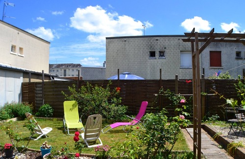 The house is located in a quiet street. The rooms are located upstairs. At the back of the house, a terrace and a flower garden.