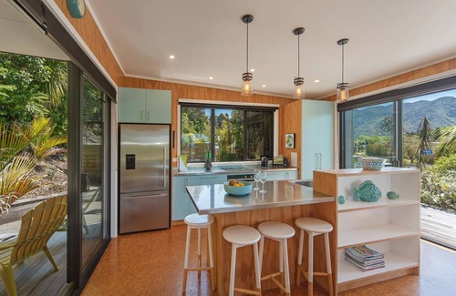 Discover Bach 7 - your gateway to Abel Tasman National Park, Marahau's golden sands, and the broader Kaiteriteri area. This architecturally stunning retreat offers seaside serenity on four decks. Whether you're dining with a view, or simply savoring the peace and quiet, tranquility and adventure unite here.