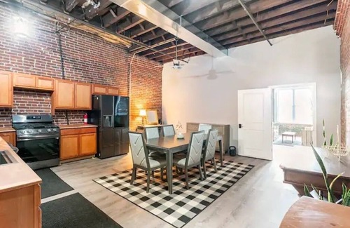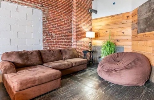 This creatively converted warehouse loft apartment is 2000 sqft and can sleep 12+ guests. Huge kitchen, large bathroom with jet tub living room, and 2 large bedrooms (with 2 queen and 2 twin beds in each). Access to our warehouse game room includes an additional full kitchen & bathroom, lounge space, pool table, ping pong, darts, TVs, and dining area. Let us know how we can assist make your stay the best possible.