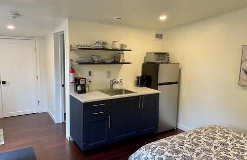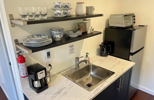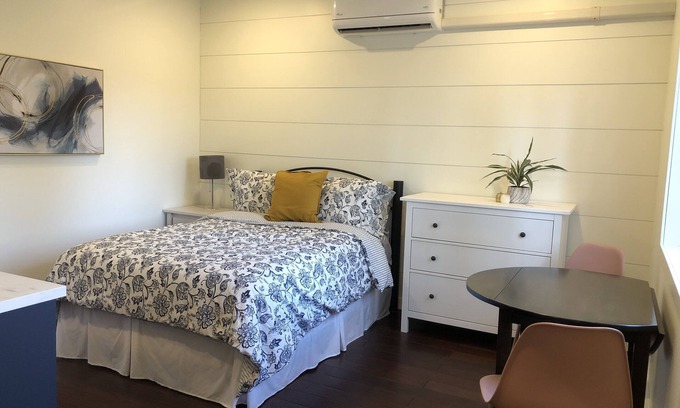 Enjoy dining on the private deck that overlooks our backyard surrounded by trees. Our chique bachelor-style apartment is small, cozy and bright with kitchen amenities, including a toaster oven, a coffee maker and a single convection countertop burner. Enjoy a/c, speedy wifi and heated floors in the bathroom. The bed is a size *double.*