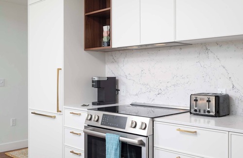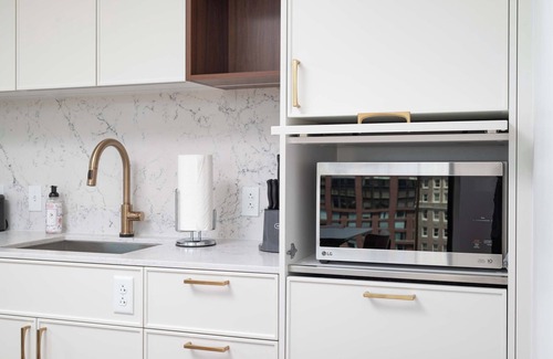 The gourmet Kitchen is fully equipped with everything you need including dishes, glasses, cutlery and pots and pans. The kitchen features Shaker-style birch cabinets and tile floors, granite counter tops and full-size Energy Star GE s stainless steel appliances (four burner stove, oven, microwave, dishwasher and side-by-side full-size refrigerator with ice maker), toaster, and coffee maker. Coffee, tea and sweeteners are provided. *disclaimer* Parking is free for monthly stays*.