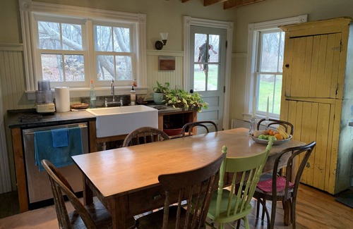 Outside, the green, expansive yard is fabulous for lounging around with beverages or morning coffee, reading, evening stargazing, (includes watching for fireflies), observing birds, playing tag or badminton, or simply listening to the crickets! It is approx. a 6 min. drive to town, or a visit to our neighbor’s horses a 3 min. walk up the road….Fresh pond is just a 10 min. bike ride away! There are chairs & small tables and hammock for outdoor relaxing, clothesline for fresh air drying & behind the garden shed, a wonderful, (highly recommended) private outdoor shower…