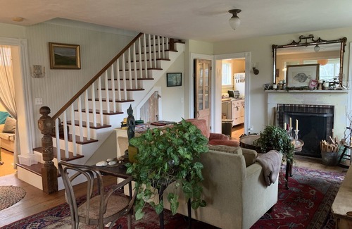 On the first floor guests will find a sunny, well-equipped eat-in kitchen w/ new dishwasher, fridge, vintage stove & walk-in pantry. Gas grill & casual outdoor dining are situated just beyond the kitchen door. On the same level— a comfy south-facing living room, small bath, & adjacent library with loveseat, desk (facing sunset) & bookshelves stocked with a variety of interesting reads!
