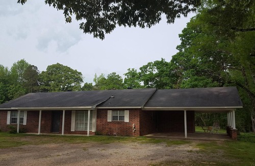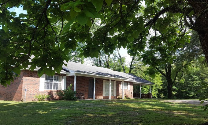 Inside the 1665 sq. ft. home, you'll find a fully equipped kitchen with full size applicances and all the modern kitchenware to whip up your favorite meals. We'll even include a dozen farm fresh eggs in memory of Pearl. Grill utensils and charcoal included for the charcoal grill. The large open floor plan living space includes a sofa and loveseat and features a gas log fireplace and a small gas heater for those chilly mornings. The 2 large bedrooms in the sleeping part of the house becomes a little more secluded with the unique hallway door. The king bedroom has a king-size bed, television. Our bunkroom has two sets of bunkbeds with 4 full sized mattresses, television and DVD/VCR player which can be rolled to other rooms in the house. The bathroom in the sleeping area includes a bathtub/shower while the 2nd bathroom off the mudroom/laundry room has a standup shower. The laundry room consist of full size washer and dryer. So even if you ended up in a rain storm while out floating, biking, hiking or diggin' for crystals, you can duck in the shower straight from the laundry. Additionally, there is a 32' carport which works out great for parking a truck with a trailer or 3 vehicles. And, if the weather is a little damp, it can even be set up for your patio party.
