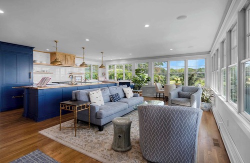 The Bahia Mar sits directly on a private beach overlooking the Peconic Bay and offers an idyllic escape for discerning guests, with meticulous design and unparalleled comfort. As you step onto the property, you'll be greeted by a vast fenced-in yard, providing privacy and ample space for outdoor activities.