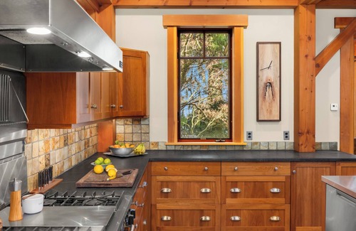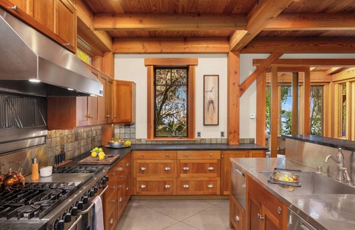 Guests enter through a serene Japanese garden, crossing a bridge to a massive front door and enter into a soaring vaulted foyer with a breath-taking view of the Cascades and Puget Sound. You will enjoy the bounty of the ocean and local farms with our fully equipped gourmet kitchen, separate catering kitchen, outside BBQ, formal dining room and a large covered outside table.