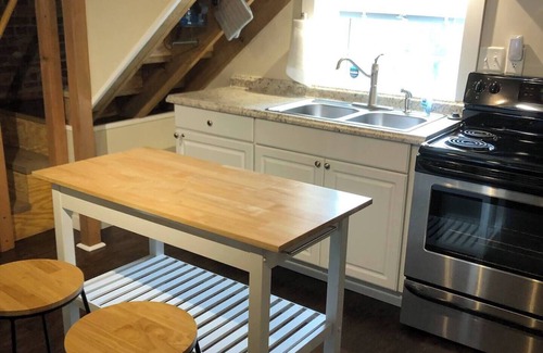Bakers Ridge Loft is special because of its cute, high-end industrial-look charm with exposed brick. The main floor has an open concept layout with a fully equipped kitchen area and rocking/reclining loveseat to watch a 55” TV. The bathroom with a large, walk-in shower is off this room, as well as a utility room with a washer/dryer.
