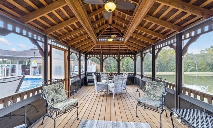 This retreat boasts amazing lakeside views from the front AND rear of the house. You can watch the sunrise over the front pond while sipping your morning coffee in a rocking chair or swing on the front porch. In the evening, enjoy a beverage of your choice in the Florida room, poolside in the gazebo, or even lakeside on a swing by the firepit, all while watching the magical sunset over the back pond.