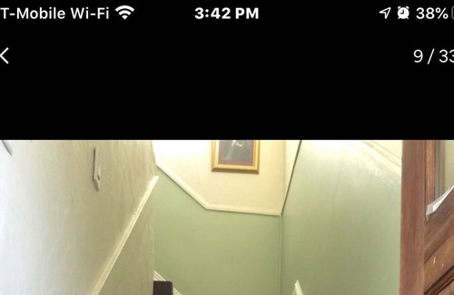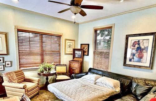 This space works well for groups that like to have more private sleeping areas. It's a 1900 Duplex with two bedrooms and 1 1/2 baths on the first level as well as a sofa bed in the downstairs living room. Another apartment above that has a bedroom with an on-suite full bath, a loft with king size bed overlooking the upstairs living room that has a sofa bed. There is an additional full kitchen upstairs and in the back yard an airstream trailer that has a queen size bed and currently has a 1/2 bath. The 1/2 bath in the Airstream is just a toilet and is separated from the living space by a clear interior glass wall.