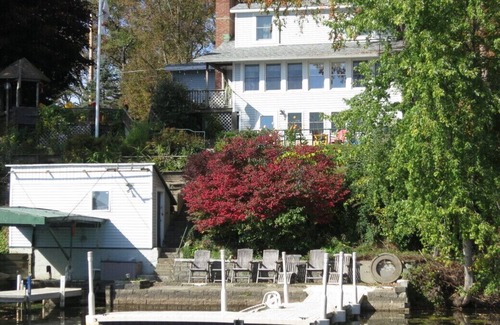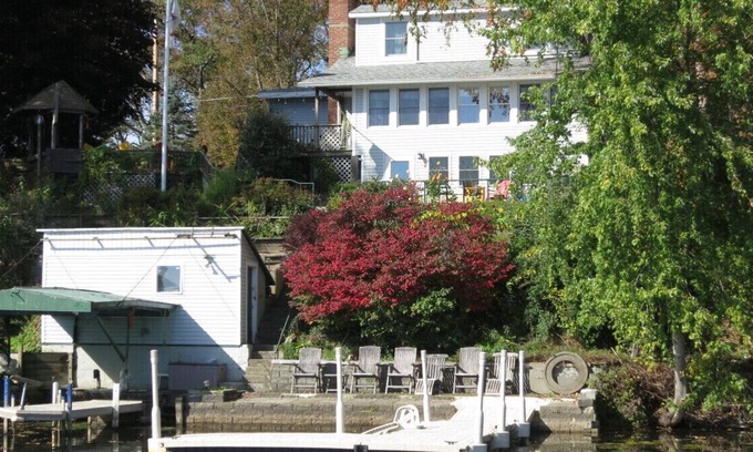 Barb's Lakeside - GOODYEAR LAKE - Enjoy a unique setting with a panoramic view of Goodyear Lake. This welcoming waterfront home is perched above the lake with terraced gardens along the stairway to the private waterfront dock. Your hosts provide 80' of private waterfront with seating and a dock. Two single kayaks, a tandem kayak and a canoe are provided for family fun on the water. There is outside seating and dining in multiple places.