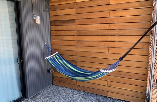 There is also a smaller desk area that provides a great laptop work area. There is a 55" 4K Smart TV located in the living area. There is a washer and dryer in the unit with enough detergent for a few loads. The unit features a custom designed pegboard system that allows longer term guests to change their storage space as their creativity and needs change. There are concret all in the unit and there a courtyard. There are custom designed metal and Polgal slider closet doors. Polgal, commonly known as 'green house material', provides a semi opaque cover and when back lit creates a unique glow...these are a modern take on traditional Japanese slider doors and lanterns. Kitchen counter tops are a restaurant style stainless steel with a unique marine edge that keeps food prep and spills from running off the surface. The darker count in the bathroom are 'paper stone', a unique recycled paper product that is impervious to water. The building was newly constructed and finished in the Spring of 2020 by award winning developer and neighborhood resident Christian Chernock. Christian is known for creating highly unique boutique style apartments and homes that depart from what is typically seen in apartment living. His spaces are highly sought after and are an inspiring experience to see.