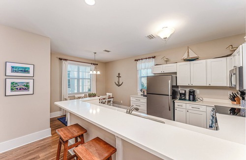 • The kitchen is open to the living area and stocked with everything you need if you choose to cook. You only need to supply your food and seasonings. You can take your pick of a conventional drip coffee maker or a Keurig. Additional appliances include a toaster, blender, crock pot and even a waffle iron!