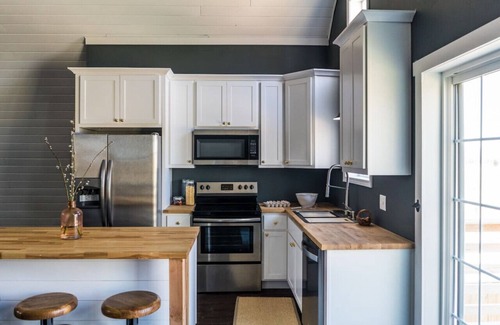 The Barn is a three bedroom, two and a half bath home. The primary bedroom has an en suite full bath, while the front bedroom has a half bath en suite. Bedrooms are equipped with USB charging ports for three devices as well as a white noise machine. The kitchen is thoughtfully appointed as well, including a Keurig. There are many books, games & puzzles in addition to a selection of records to enjoy. A washer and dryer are also on site as well as an iron and ironing board.