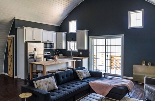 Upstairs is the loft like living area with soaring ceilings, two living areas in addition to a large dining table. The fully appointed kitchen features a dishwasher if you’d like to cook at home. Enjoy our selection of records on our turntable or use the Bluetooth connection to play your own music on the stereo. A wood burning fireplace is next to the bar which is filled with different glassware to make your favorite cocktail. The shuffleboard table is great for friendly competition through the evening!