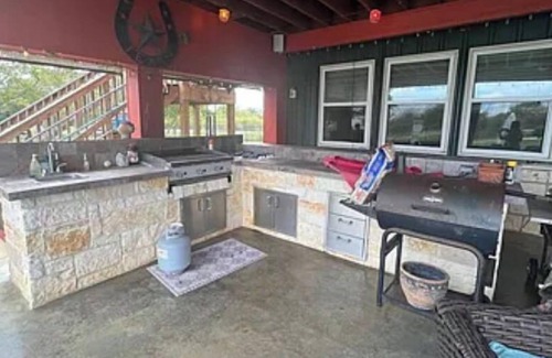Barndominium with Pool & Swim up table, Outdoor kitchen, large soaking tub in larger bedroom. Beautiful view from the kitchen across the pool and small stock pond with a bridge and island. Sleeps up to 6 adults and 2 children.