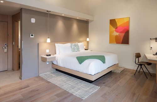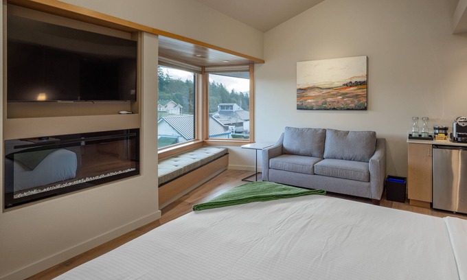 Luxury King Hotel Room plus double sofa bed with partial water view of Eastsound Bay and surrounding Village of Eastsound on Orcas Island, WA