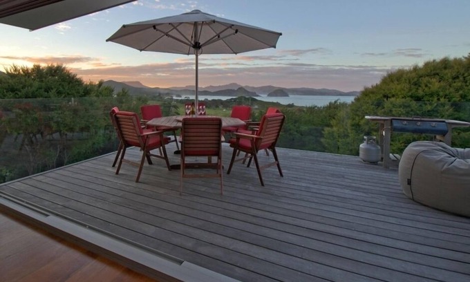 Has amazing, unobstructed North-facing 270 degree views over Medlands beach, bay and mountains beyond. Just a few minutes walk to spectacular Medlands beach via road or a bush track. The entire house is eco friendly with drinkable rain catchment water, solar panels providing all electrical power and solar water collector for hot water.