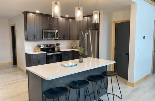Enjoy all that Killington has to offer in this new construction, centrally located, spacious and luxurious home. Set on 3.5 acres in the heart of Killington this home abuts recreational trails for mountain biking, hiking, snowshoeing, and is only a 3 minute walk to public transportation for Killington & Pico Mountain. The Base Camp Retreat is a 3 bedroom, 3 full bathroom, custom built home. When you enter you will find a mudroom area large enough to host all of your belongings. The main floor includes a spacious kitchen with quartz countertops and stainless steal appliances, an open concept dining room/living room with vaulted ceilings and a beautiful fireplace, 2 sliding doors that take you to a full deck overlooking the gorgeous scenery of Killington, and a master bedroom and full bathroom. The upstairs includes 2 more bedrooms and full bathroom. Head downstairs to the walkout basement that includes an additional living room space with 2 full over full bunkbeds with twin trundles for overflow sleeping space, a game room that will entertain the entire family, another full bathroom, and access to the hot tub outside. The house has 4 smart TV's all available to stream your favorite movies and TV shows, Wi-Fi, and plenty of amenities so you and your family will have all their needs met during your stay.