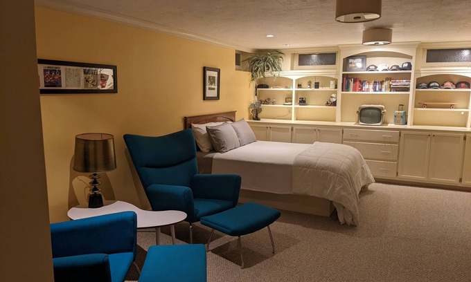 The basement apartment has a private entrance. As found in many hotels, the living room and bedroom are combined. It features Mid-Century Modern furnishings. A remote controls the whisper quiet air conditioning/heating unit that is separate from the rest of the house. You'll sleep soundly in the queen sized bed that has luxurious Sateen sheets. The kitchenette includes sink, refrigerator, microwave, coffee maker, dishes and flatware. A private modern bath features an Industrial Chic design. You'll have access to secure fast WiFi. Street parking is available. A unique key code will be issued prior to check in. The apartment is located in the Sunnymede neighborhood, one block south of historic Wayne St. (where Knute Rockne lived!). It's 1.5 miles to downtown, and near many good restaurants and entertainment venues. It's walkable (but a long walk, 2.1 miles, 47 minutes) to Notre Dame but most guests take Uber or drive. It's located in a nice, quiet neighborhood.