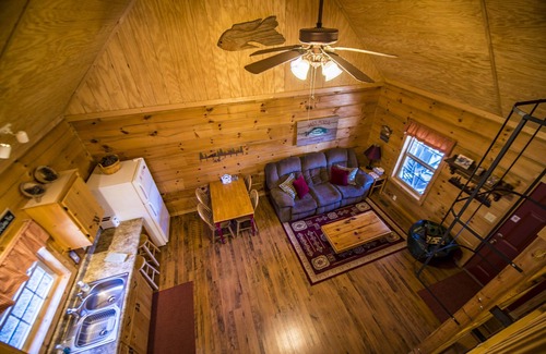 Guests are sure to enjoy a memorable vacation in this fully furnished, 2 bedroom/1 bath cabin with a hot tub. The main level bedroom has a queen bed, while the loft accessed by ladder is furnished with 2 twin-sized beds, comfortable for sleeping 4 people. The large living room with a stacked stone gas log fireplace is furnished with everything you need to relax. The kitchen is perfect for dining as it is equipped with all utensils, cookware, and a Keurig K-cup coffee maker for starters.