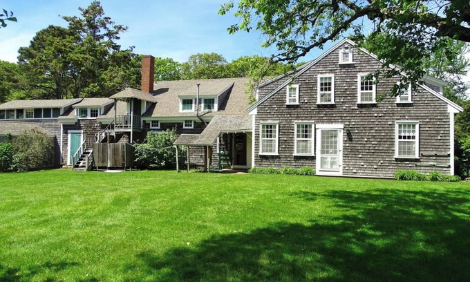 Beautiful Bass River waterfront estate looking out to Bass River and Nantucket Sound is an ideal vacation getaway for large family gatherings. The property features a private beach, private dock for up to 2 boats, a large yard, and gorgeous views. Located on the estate are two houses. Antique farmhouse (Old House) with 9 bedrooms, 3 baths [1 handicap accessible] as well as a cozy Boathouse with 5 bedrooms, 1 1/2 baths. The houses are offered together to comfortably accommodate extended family groups of up to 28. A third House that sleeps 6 people is also on the same property if you need more room. Each home is equipped with a full kitchen, laundry, outdoor shower, porch, outdoor furniture for outdoor dining and much more. Ten minutes from supermarkets, and restaurants. Houses are available separately