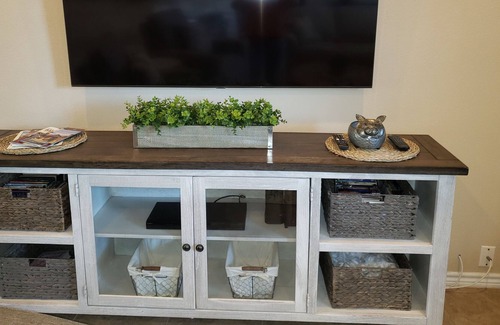 This gorgeous, remodeled home sits high on the hill top in historic Bastrop, TX. It's located in Tahitian Village a unique, hilly and wooded area of Bastrop. It's a perfect place to relax and unwind. It offers two driveways for larger trucks or Rv's. Located only minutes from downtown Bastrop and Smithville. Bastrop State Park is only 7-8 minutes away. Downtown Austin, Circuit of Americas and Austin Airport are a short 35 minute drive. Home is remote with secluded, private fenced backyard and sits on almost one acre of wooded cliffs with large patio area with outdoor seating. Enjoy the cliff top views above a creek, while using the gas fire pit. There is also a covered patio with patio furniture & a gas grill supplied for grilling. The smaller children can enjoy the play set with swings and sandbox. There are many restaurants, shopping, antique stores and much more in both Bastrop and Smithville. A short 4 minute drive to Pine Forest Golf Club. The entire interior has been newly remodeled and nicely furnished. The kitchen boasts a breakfast bar with bar stools, 42" cherry cabinets, granite countertops and stainless appliances. It is fully stocked with everything you would need for a gourmet meal. There is a large, 6 person farmhouse table to enjoy your meals and a comfortable living room with a new 65" TV and VCR with many movies to choose from. and 2 swivel recliners. If you need to work, we have a desk area with free wifi. Currently TV service is only internet TV, no cable or phone are provided. The master bedroom offers a very comfortable king size bed, a 55" flat screen TV, an en-suite bathroom with large walk-in shower, soaking tub and double vanity with granite counters. Wall mounted hair dryer, make up mirror and shampoo, body wash and conditioner are provided in master bathroom. There is also a huge walk-in closet. The 2nd bedroom offers a bright and sunny queen bedroom with 50" flat screen TV. The 3rd bedroom has a trundle twin bed, with a pull out drawer bed for a second child and a 32" flat screen TV. There is also pack n play for the baby. Laundry room with washer and dryer with laundry soap, iron, ironing board and laundry basket. This property is fully stocked with all kitchen cookware, crockpot, regular coffee pot combined with Keurig, Kitchenaid blender, toaster, spice racks, milk shake maker, all linens, towels, hairdryers and much more. Paper towels, toilet paper, hand soap, dish tablets, and garbage bags are provided. Minimum Rental Age is 25 years.No Smoking indoors (penalty will incur).NOTE: There is a long, dangerous drop off beyond the fence. Do not go beyond the fenced area. Also, the road leading to our house has very steep hills for a few miles. Owner is an IL & FL licensed realtor
