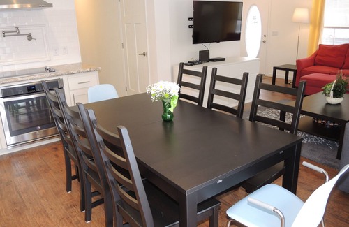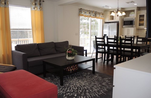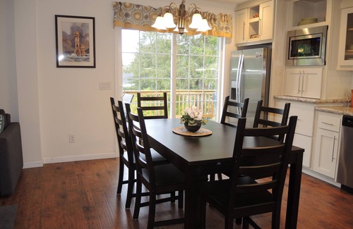 Bateman Cottage has a 450 square foot wrap around deck - ideal for outside dining and enjoying the natural beauty of the area. The open floor plan is comfortably furnished with contemporary décor. Sliding glass doors lead from the kitchen and dining area to the open deck. The contemporary kitchen is truly a chef's delight.
