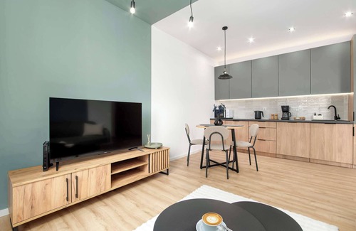 The apartment has been designed with a romantic stay for two in mind, though it can comfortably accommodate up to three guests. The interior combines modern and minimalist style with cozy accents, creating a harmonious and peaceful atmosphere. The heart of the apartment is the living room with a comfortable sofa, where light mint and white walls, combined with abundant natural light, create a pleasant and relaxing space. Evenings can be spent watching favorite films on a 50-inch television with access to streaming platforms such as YouTube and Netflix. The living room flows seamlessly into a modern kitchenette, featuring mint and wooden toned cabinets. The kitchenette is equipped with an induction hob, microwave, dishwasher, and drip coffee maker, while the toaster and dining table make breakfasts and romantic dinners enjoyable. The bedroom is distinguished by a dark gray wall contrasting with the remaining white walls, and the comfortable double bed, 140 cm wide, ensures a restful sleep after a day full of experiences. The bathroom is finished in a modern style with gray tiles, wooden accents, and flooring, while the black-and-white fittings add a touch of elegance. It includes a shower and washing machine, providing great convenience for longer stays. Additional equipment such as an iron, ironing board, and clothes dryer ensures full comfort. The apartment welcomes pets, making it an ideal place for traveling with a beloved companion (for an additional fee).