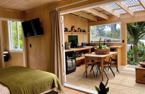 A tropical studio paradise for guests to enjoy in total comfort. Natural timbers mixed with quirky touches, blending beautifully into the Great Barrier Island environment. With total guest comfort in mind, you will enjoy a comfortable king size bed for a great nights sleep, a brand new bathroom with large shower, gas hot water and adjustable shower nozzle.