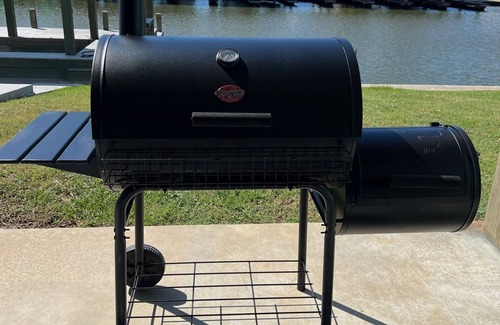 Downstairs, there is an outdoor shower, picnic table and charcoal BBQ pit available to use. After catching your limit of fish, pull your boat right up to the house and tie off to the boat slip. No boat? Kids and adults will love fishing right outside of this cabin in the canal. We also have two kayaks with lifejackets available for your use.