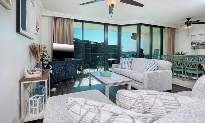 Interior: With floor-to-ceiling windows in the living and dining areas, carpet and tile flooring, and ample comfortable seating including a queen sleeper sofa, you'll feel right at home as you soak in the stunning views of the bay, lazy river, and beautifully landscaped green space.