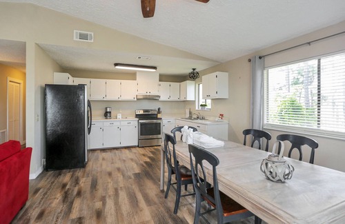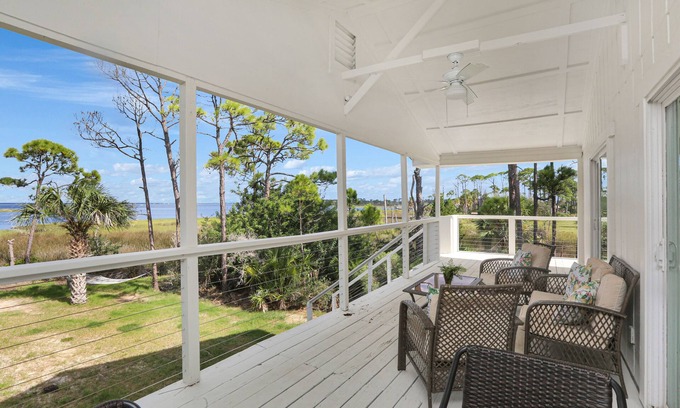 We have all heard about the white sand beaches of Cape San Blas, but have you ever thought about visiting the other side of the Peninsula? The Gulf of Mexico is on the beachside of Cape San Blas, but nature’s playground awaits on the other side in St. Joseph Bay. Come stay in Hideaway Bay, a 2 bedroom single family house that sits overlooking the bay. Bring your kayak or your paddleboard and access the water easily at the end of the private boardwalk. Natural vegetation surrounds this home creating a buffer that makes for a perfect retreat from the everyday grind. Once inside this home, it is situated all on one level, a rare find these days. Take a break on the bayfront deck and relax under the ceiling fans while reading a good book.