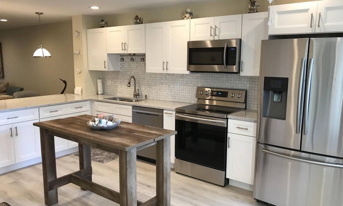 The condo has a king size bed in the master bedroom, a newly renovated master bathroom, 1 full size bed and 1 twin size bed in the second bedroom, and a full size 2nd bath with tub/shower. There is also a full size inflatable mattress with sheets. Included are 2 flat screen TVs, free Wifi, use of 2 bicycles, linens, towels, a hairdryer, and an iron board and iron. The kitchen includes all the items you could possibly think of including a microwave, dish washer, full size refrigerator, coffee maker, etc. Additionally there are summer reading books and start up materials such as paper towels, toilet paper, detergent, etc. All we ask is that you replace what you use. There is a laundry unit steps from the unit next to the elevator.