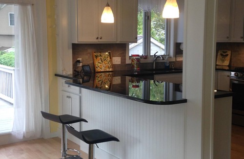 First floor---The cottage has a lovely porch where you can rock and say 'hi' to the neighbors and on some nights hear the live music from Top 'O the Bay. As you go through the front door a comfy living room area greets you. There is a large TV in this room and the couch opens up to a queen size bed with a Tempur-Pedic mattress--it's actually very comfortable! The full bathroom has a large walk-in shower. The kitchen has new black granite with white cabinets making it light and airy. There is a second living room across from the breakfast bar for socializing and a dining table that seats 6. There is a full size washer and dryer as well in this area.