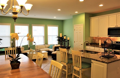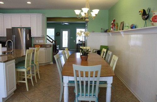 The second level has an open floor plan with lots of seating and a half bath. We just installed a new wood look tile floor and hardwood steps to the first floor. We also put LVP throughout the rest of our home and 2 new HVAC units. The family room has access to the front deck for dining al fresco and outside bench seating. There is also a game table with some board games. The well equipped kitchen is complemented with new upgraded stainless steel appliances, gorgeous granite, a long dining room table for 12, and an island with 2 bar stools. There is also a morning room with a flat screen, a wicker sectional, a mini pool table, a couple of wicker chairs and ottoman to put your feet up, maybe to read or just surf the internet with our included WiFi.