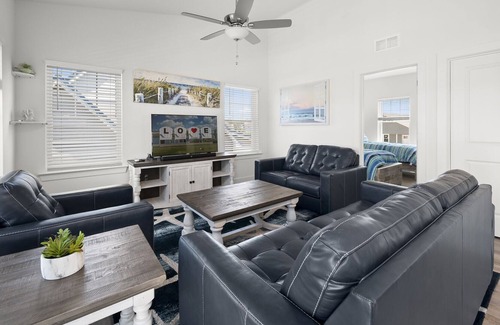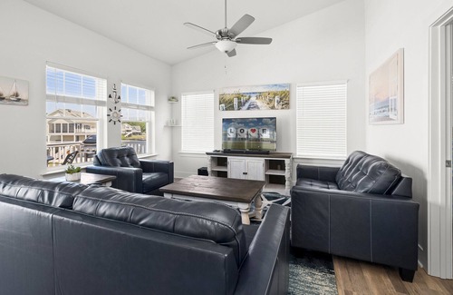This statuesque Vacation Home is adorned in an alluring beachy blue, with crisp white trim - it just screams Beach Vacation. Sleeping 8 in 4 spacious Bedrooms, this Reverse Floor Plan home truly has it all. As you climb the steps to the 1st Floor, you’ll find 3 Bedrooms, 2 Full Baths, and the Laundry Area. Bedroom 1 is the Master with a comfy King Bed, beachy distressed furnishings, Flat Screen Satellite TV with Streaming, and floors reminiscent of a stroll on the Boardwalk. With private access to the 1st Level Deck, you can slip out to stargaze while the rest of the family slumbers. Or sip your morning coffee while watching Herons and Egrets fish for their morning meal. The Private Master Bath has a Double Vanity and spacious Walk-in Shower.