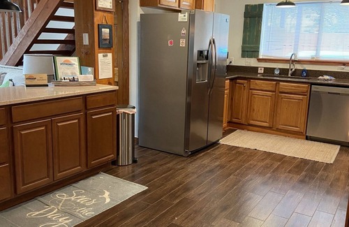 The Cabin is a three-bedroom, three and a half bathroom home with a well-stocked kitchen, beautiful hardwood details, an expansive lawn, and gorgeous custom dock perfect for sunset viewing. Sleeps 10 people with additional on fold-up mattresses (2 twin & a queen.)