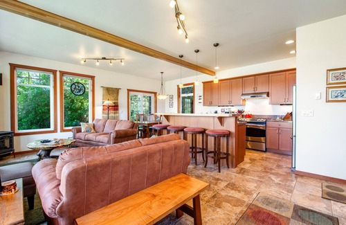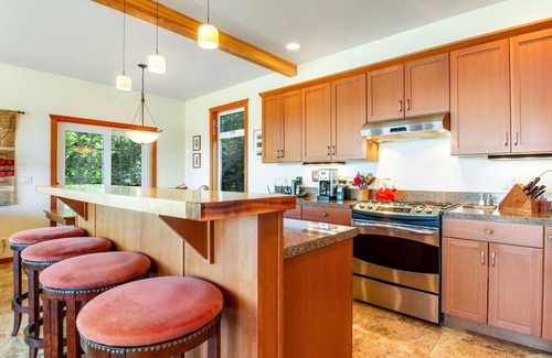 Inside, a sunny living area awaits with comfortable furniture throughout and terrific bay views - it's conveniently warmed by a gas stove. The adjoining full kitchen is completely equipped with all stainless steel appliances and a three-person island. More formal meals can take place at the nearby four-person dining table. There is another living area upstairs with unbelievable views of the bay, plenty of sofas (including two recliners), and a flatscreen TV.