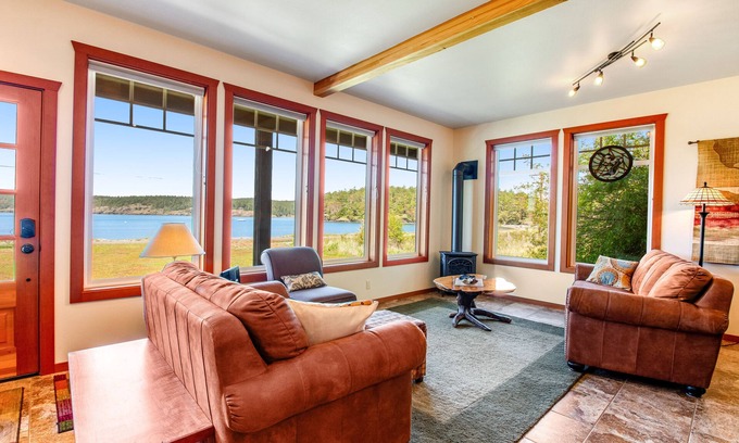 Bayfront home w/private beach, water/mountain views, gas grill, deck, gas stove is located in Lopez Island. Bayfront home w/private beach, water/mountain views, gas grill, deck, gas stove provides accommodation, featuring Parking, Ocean View, Balcony/Terrace, among other amenities. This House features Parking, Ocean View, Balcony/Terrace, to make your stay a comfortable one.